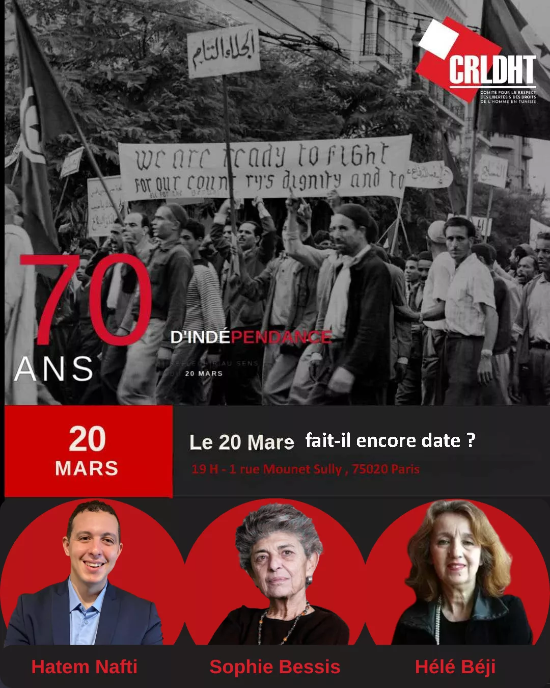 À l’occasion de cet anniversaire, une initiative du CRLDHT a réuni des voix intellectuelles et militantes autour d’une interrogation volontairement dérangeante : la date du 20 mars a-t-elle encore un sens ? Ou bien a-t-elle été à ce point instrumentalisée, retournée, vidée de sa substance, qu’elle ne permet plus de penser le présent ?